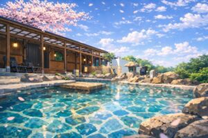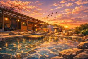 夜の景色に包まれた温泉を楽しむ。