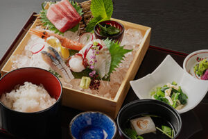 新鮮な季節のお刺身が魅力のお膳です。小鉢とセットで是非お召し上がりください。