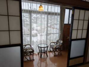 ↑休館の和室からの庭園風景。