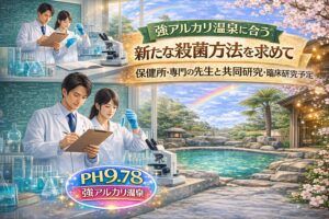 ✔ 強アルカリ温泉との相性が良く ✔ より効率的な殺菌が可能 ✔ 塩素臭の軽減も期待できる といった可能性があります。
